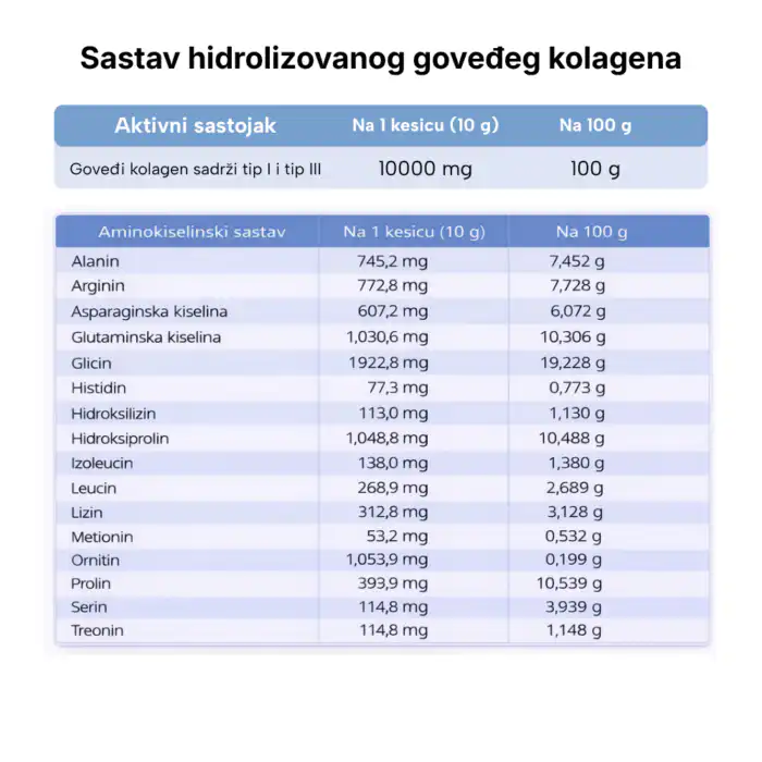 | Goveđi kolagen sadrži tip I i tip III | 10000 mg | 100 g |
